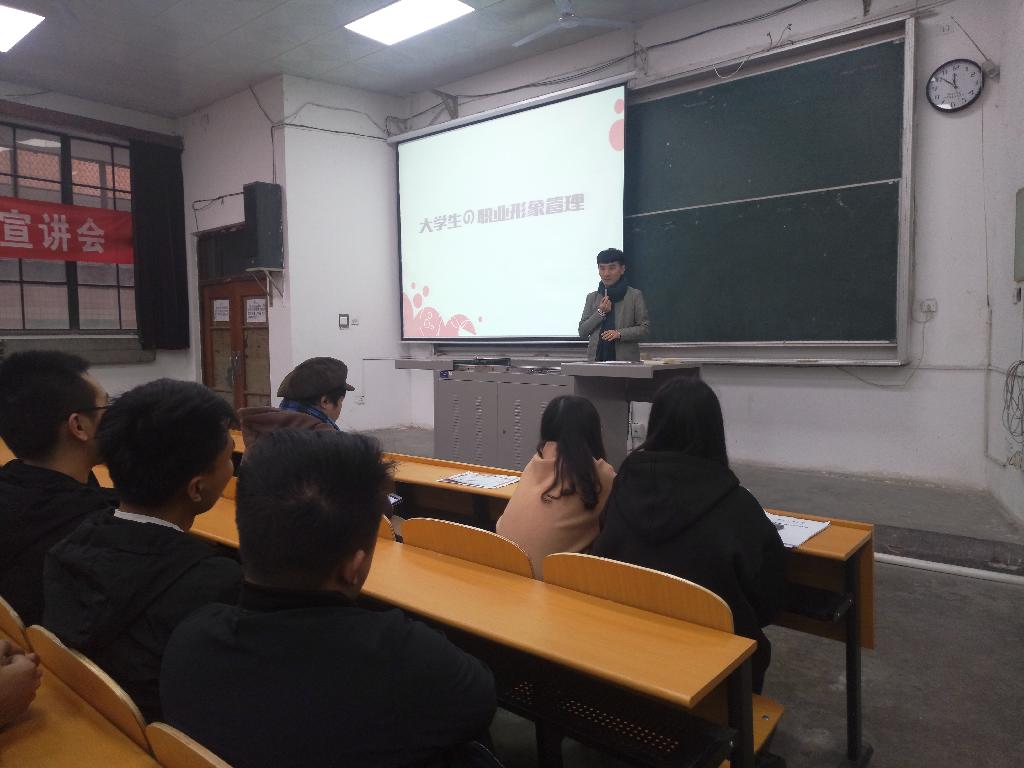 为了提升学生职业形象,提高学生的就业竞争力, 10月17日,艺术与传媒学院邀请了学院优秀毕业生代表刘雷雷,回到母校为在校艺术学院学生带来“大学生职业形象打造”专题讲座,讲座由学院团委书记杨海斌主持。