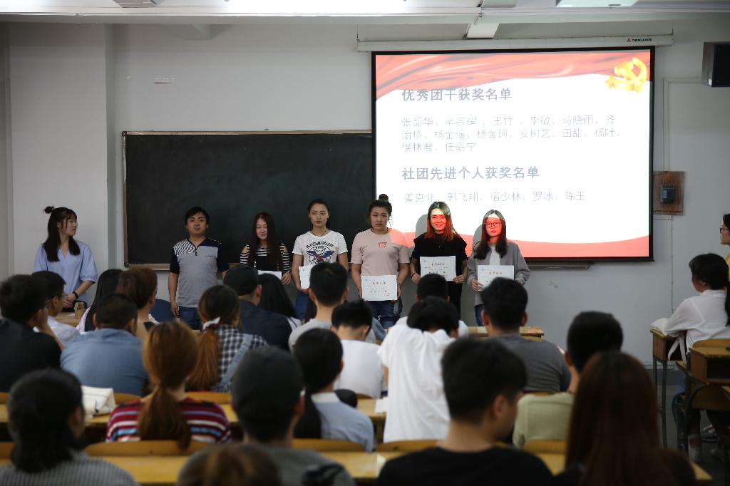 王倩宣布了学校表彰决定,杨海斌为获得表彰的4个团支部、10个团小组、69个先进个人分别颁了奖。