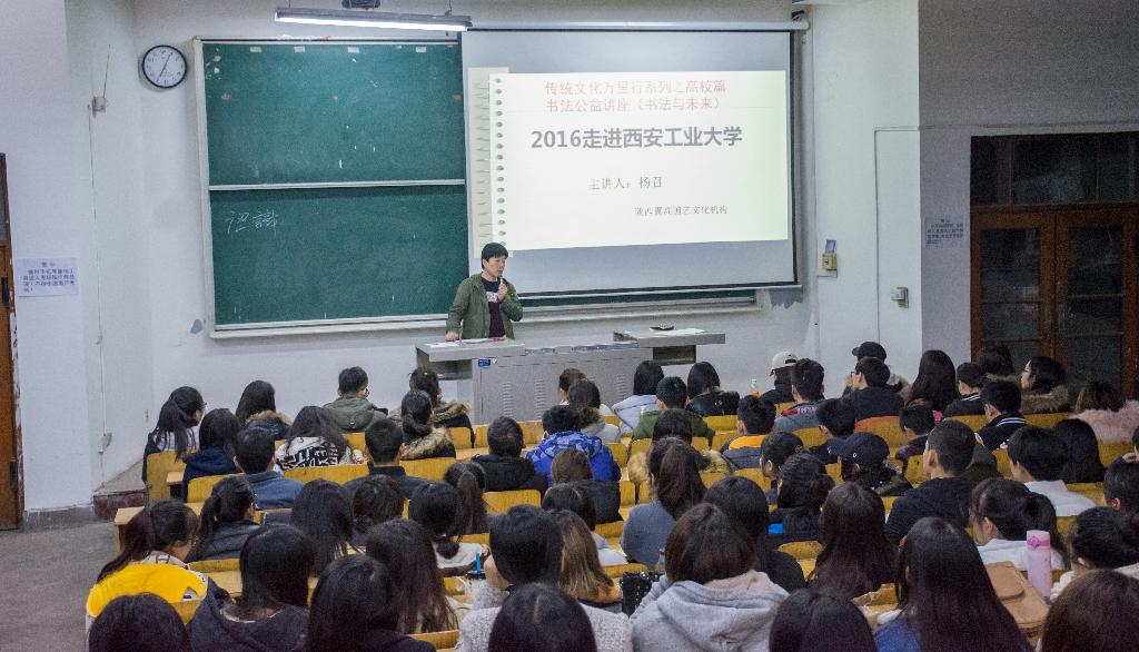 为了拓展学生们专业素质,较强素质能力方面的交流。11月23日,艺术与传媒学院在金花校区教4F-J2教室举办了“书法与未来”学术讲座,本次讲座邀请了知无堂主人、西安航空学院书法教师杨召老师主讲,学院团委书记杨海斌、辅导员杨娜娜和书法学、产品设计、环境设计等专业近二百名学生参加了讲座。