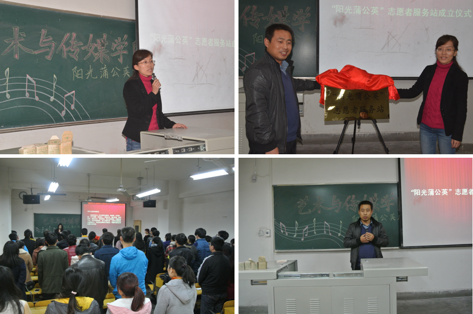 ‘阳光蒲公英’志愿者服务站”成立仪式在我校金花校区教六楼206教室隆重举行。仪式由杨海斌老师主持,学生处副处长、校团委副书记张英老师出席了成立仪式并作重要讲话,参加仪式的还有艺术学院张晓宾老师、学院主要团学干部及志愿者代表。