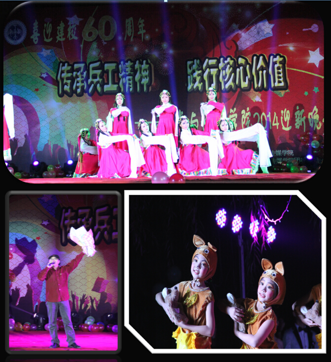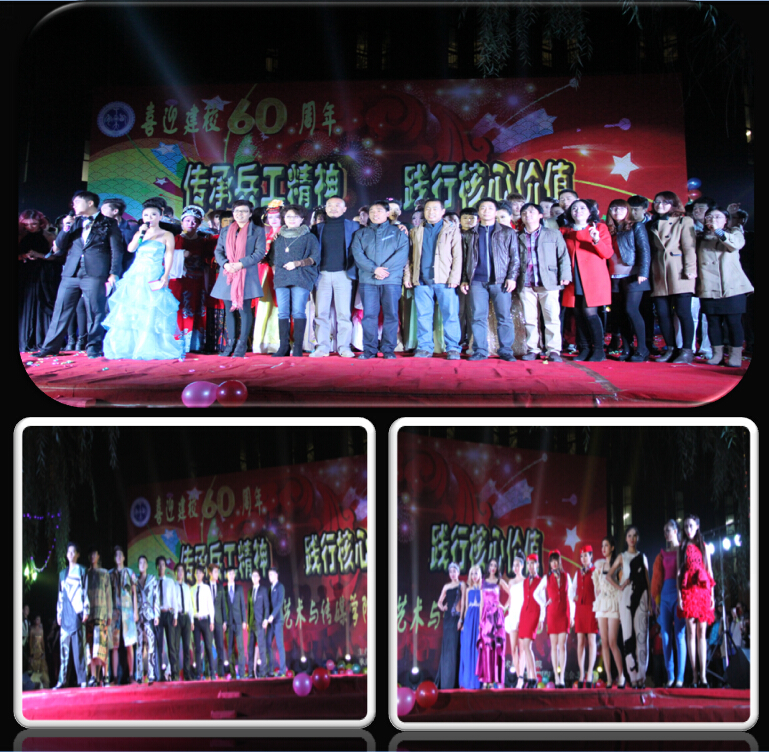 晚会分为“忆六十载峥嵘岁月、展青春秀美华章、汇工大美好明天”三个篇章。两位大一新生的劲爆开场曲拉开了晚会的序幕,唯美的藏舞“康定情歌”让现场观众心驰神往,仿佛走进了神秘的雪域高原;于唯德院长倾情演唱的歌曲《母亲》掀起了全场师生的热潮;歌舞、杂谈、魔术、戏曲等众多表演形式,无不让人为之叹服,精彩的节目引人入胜,全场观众也情不自禁地一起高歌起舞,将青年学子朝气蓬勃的精神风貌体现得淋漓尽致,掌声和欢呼声此起彼伏,与台上节目相映成趣,热闹非凡。党总支副书记金娜老师的歌曲《请跟我来》,更引得全场师生齐声高唱。两支电音乐队的歌曲《平凡之路》、《无地自容》、《故乡》点燃了晚会的高潮。四位男生集体带来的杂谈《西工传》既诙谐幽默、又立意深刻,给新生们带来欢声笑语的同时体现了艺术学院学生良好的精神风貌。全体辅导员联袂带来的歌曲联唱,将整台晚会的气氛推向了最高潮。晚会在歌曲《相亲相爱》中圆满落幕,相信每位新同学都会带着美好的憧憬编织自己的大学梦,并在今后的大学生活中通过努力将梦想一一实现。