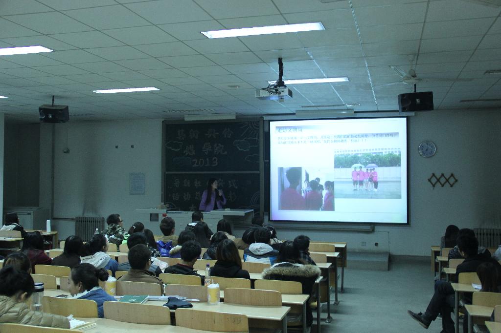 2013年的暑期实践情况。接着张晓宾老师介绍了暑期社会实践的总体情况,他说 :全国大中专学生暑期“三下乡”活动是大学生在大学生活中必须经历的课程,是理论与实践相结合的最好机会,并为大家的实践活动提出宝贵建议:1.从生活中选题,多关注时事和生活;2.选定课题后进行答辩,解决困难;3.项目优化运作;4.回顾课题,感悟课题,总结课题。大会第三项分别由优秀实践队:萤火之光实践队、食尚先锋实践队、法制先锋实践队、追梦行动实践队、反古潮流实践队的队长张娅芳、赵晋锐、江鹏飞、王宁、袁梦同学就各队的实践情况向大家详细做了介绍。