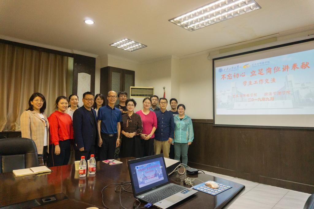 为深入开展“不忘初心、牢记使命”主题教育,立足辅导员工作岗位,不断提高学生工作的质量,9月24日,艺术与传媒学院与经济管理学院在金花校区二楼会议室开展“不忘初心,立足岗位讲奉献”学生工作交流。艺术与传媒党委书记周著、副书记金娜,经济管理学院党委副书记程新峰以及两个学院的全体辅导员参加此次交流座谈会。