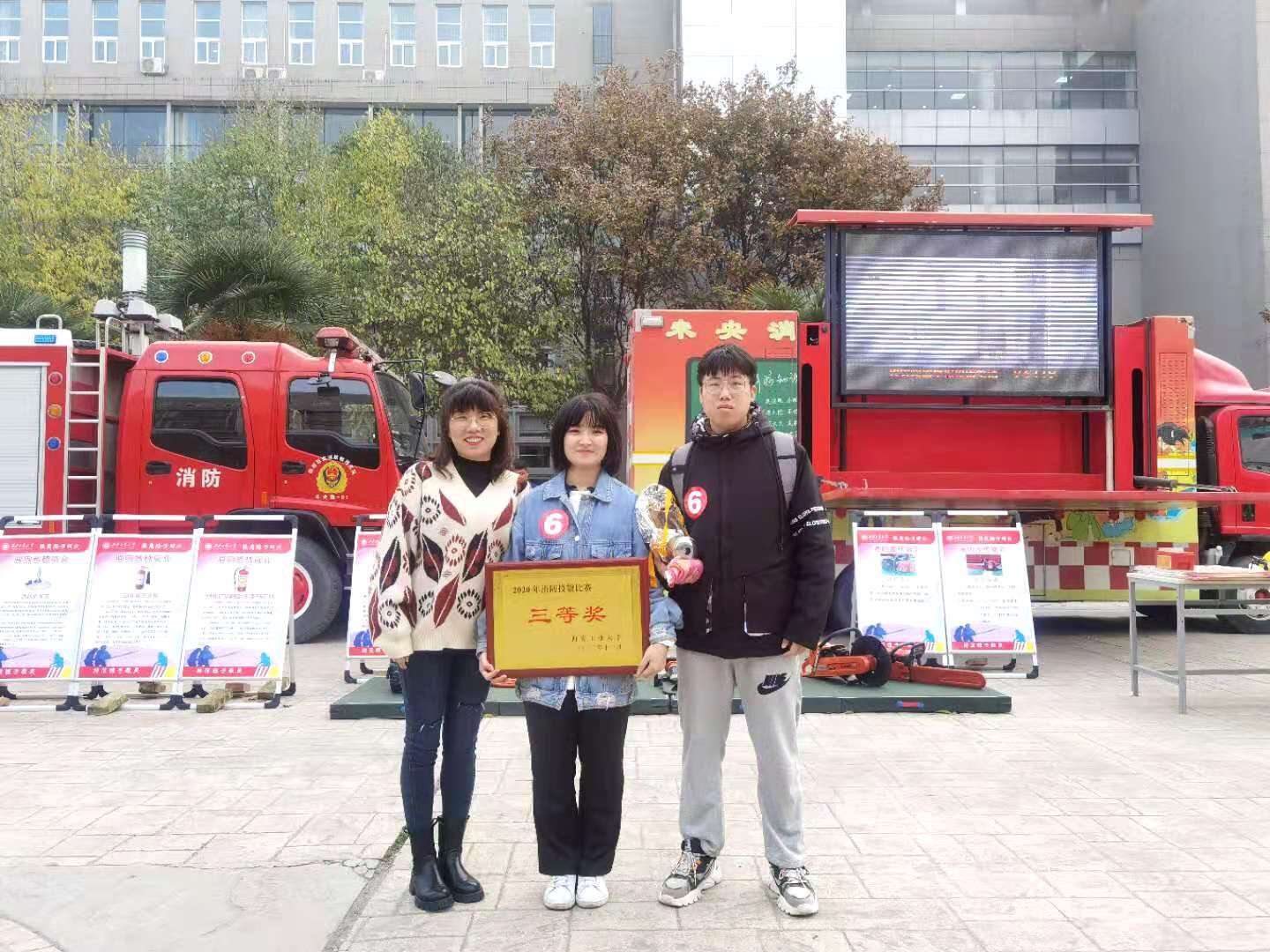 学生行动迅速,动作干净利落。穿过烟雾逃生阶段时,马淑婷同学冷静应对,动作标准,迅速通过完成接力。杨豪同学熟练的运用电子灭火器进行灭火,在争取取得良好成绩的同时也不忘安全。最终取得了灭火及烟雾逃生决赛三等奖的优秀成绩。