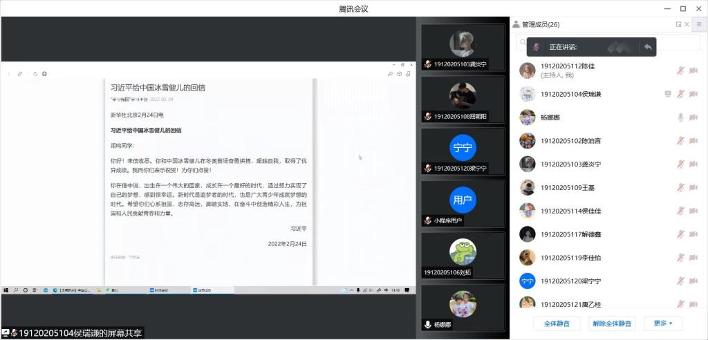会上,杨娜娜与同学们通过观看视频的方式回顾了北京冬奥会上中国冰雪健儿的夺金时刻,当每一次国歌奏响国旗升起时,大家都非常激动,纷纷留言送上祝福。随后杨娜娜带领同学们学习了习近平总书记给中国冰雪健儿的回信,并强调这封信情真意切、意义重大,每字每句都饱含着习近平总书记对冰雪健儿及幕后工作人员的关怀及厚爱,体现了习近平总书记对我们新时代青年追求卓越和报效祖国的肯定与殷切希望。最后杨娜娜号召全体学生认真学习领会习近平总书记对青年人成长成才的谆谆教导,坚定理想信念,让青春在不懈奋斗中绽放绚丽之花。