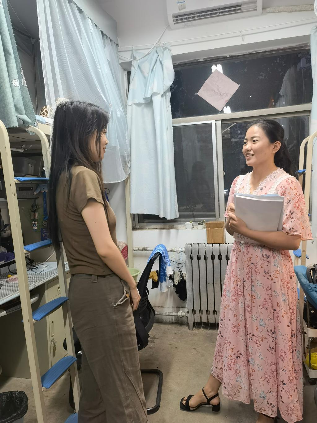 会议结束后,董丹丹走进学生宿舍进行走访排查,时刻关注学生思想动态。