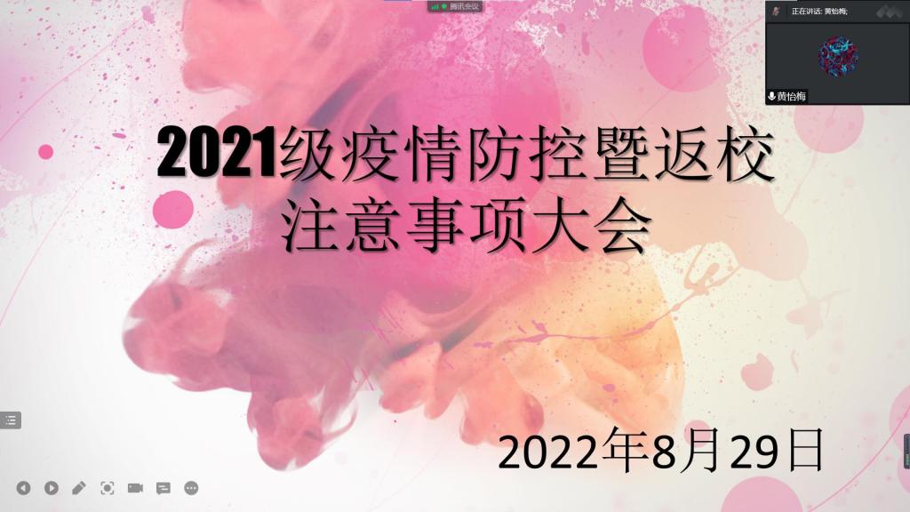 为切实做好开学前疫情防控工作及返校前注意事项,艺术与传媒学院2021级于8月29日晚通过线上会议的方式召开疫情防控暨返校注意事项大会,会议由辅导员黄怡梅主持,2021级全体学生参加。