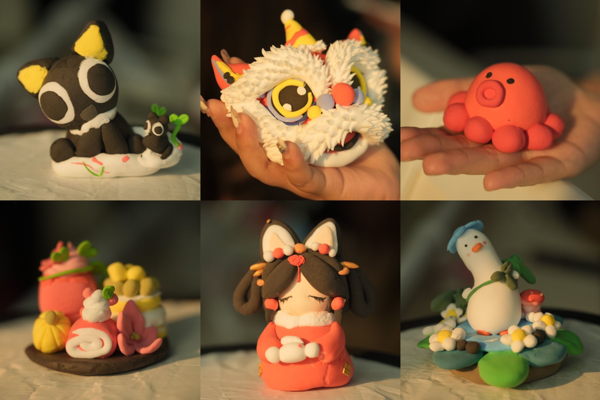 同学们充分发挥特长,将自己的想象力、创造力、观察力和记忆力融入到粘土创作中,制作各种造型独特、生动有趣的作品。有的同学致敬国家级非物质文化遗产——彩扎,尝试制作小巧精美的醒狮狮头,还有一些同学仿照中华传统民间艺术——泥人面塑,展示自己的绘画和雕塑技巧,塑造各种栩栩如生的形象。整个活动在轻松且活跃的氛围中有序进行,思维和灵感的碰撞诞生了许多的杰作。