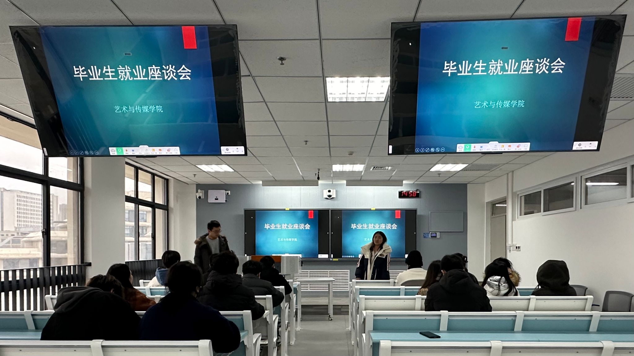 会议伊始,董丹丹向同学们说明了此次座谈会的目的和初衷。随后,与会的同学讲述了在求职中面临的困境,董丹丹和许金鑫针对同学们择业就业过程中出现的问题和困难依次进行了解答,给出了具有针对性的建议,鼓励同学们在求职中要增强自我信心、找准合理定位、强化专业本领,正确科学地选择适合自己的工作岗位,实现自己的奋斗价值。