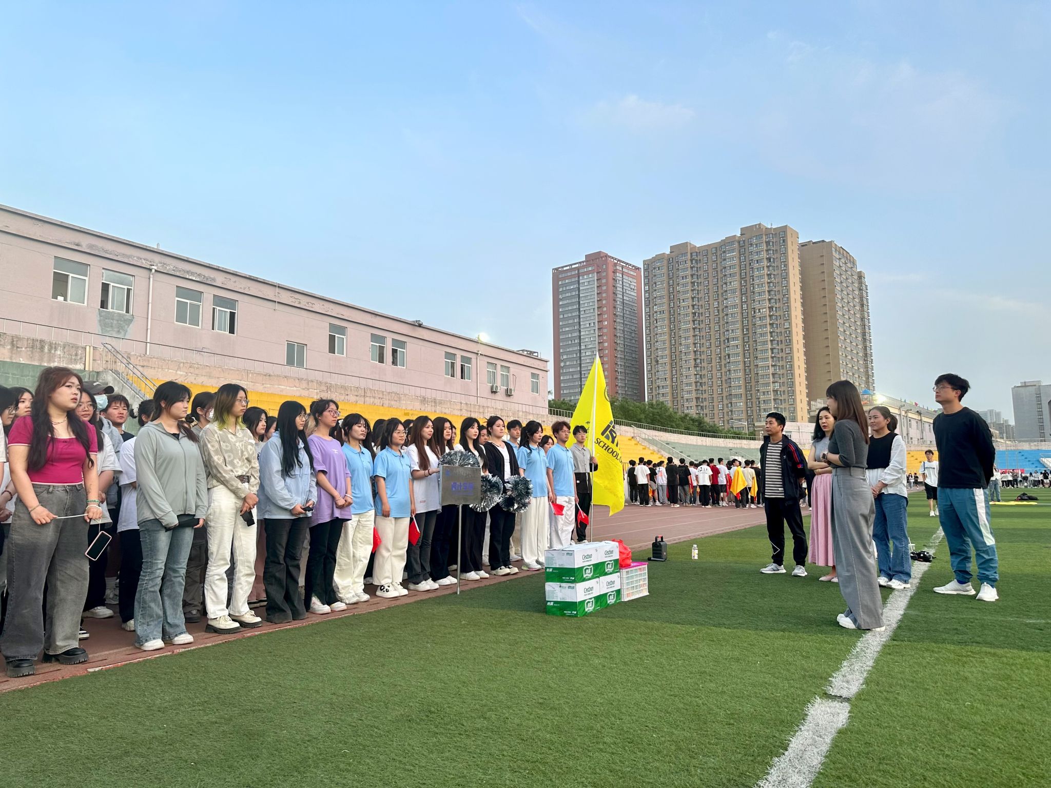 党委副书记周倩、团委书记及全体辅导员来到未央校区体育场慰问学院2024年春季运动会备赛运动员及方阵表演人员。