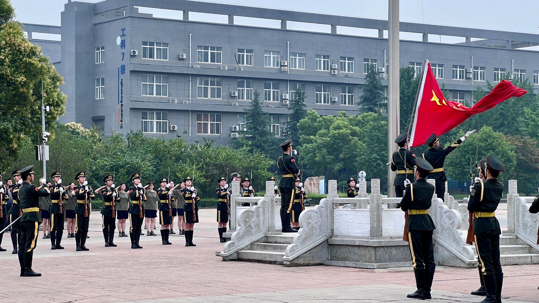 上午6点50分,随着清晨的第一缕阳光,学院全体师生整齐列队。国旗护卫队迈着坚定有力的步伐,护送五星红旗来到升旗台前。7点整,伴随着雄壮的国歌声,旗手动作娴熟,将国旗升至旗杆顶端。鲜艳的五星红旗在阳光的映照下迎风飘扬,学院全体师生纷纷行注目礼,齐声高唱国歌,场面庄严肃穆。