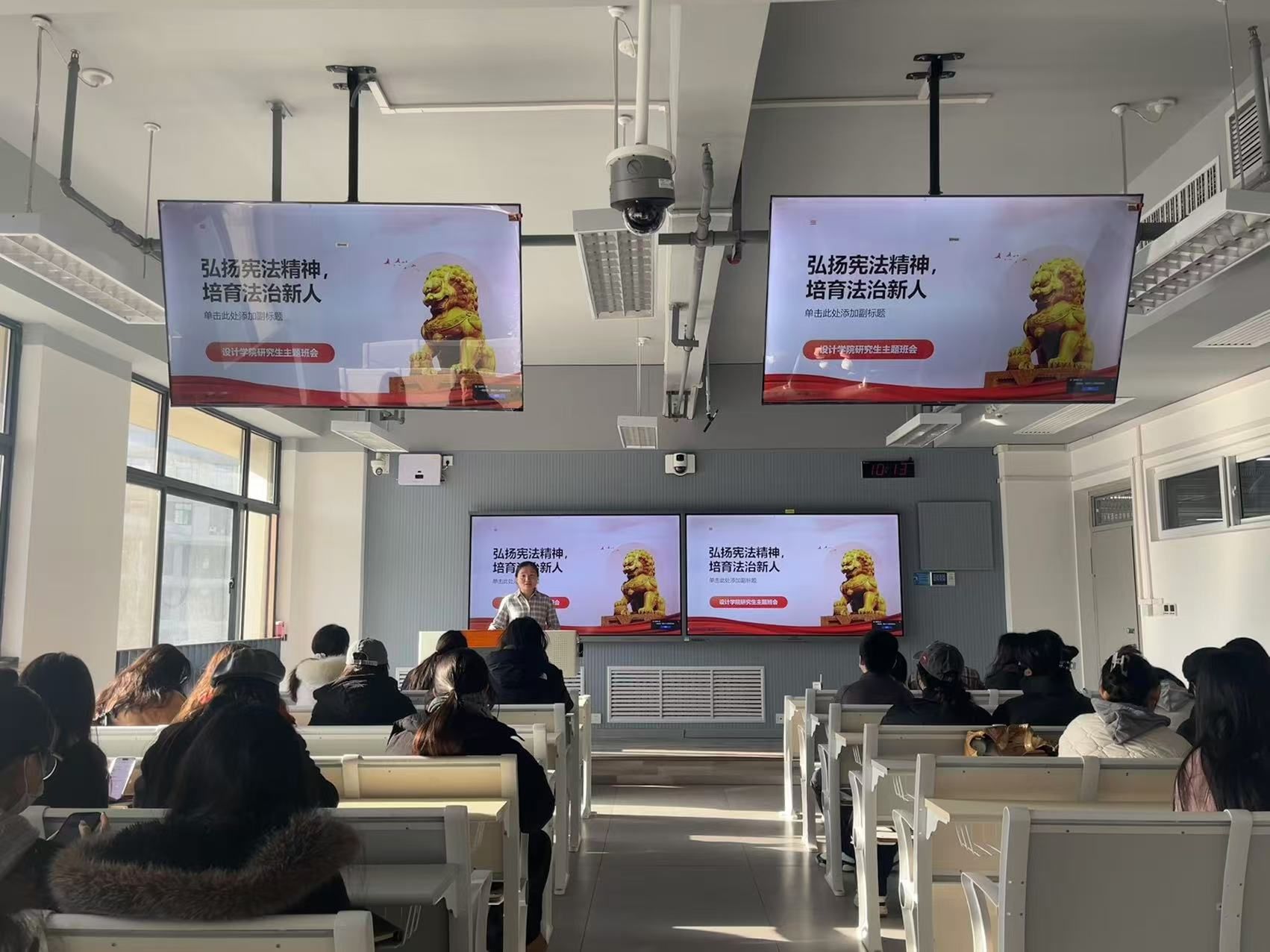 研究生于教7-315开展“弘扬宪法精神,培育法治新人”主题班会,辅导员贾宇星主持。