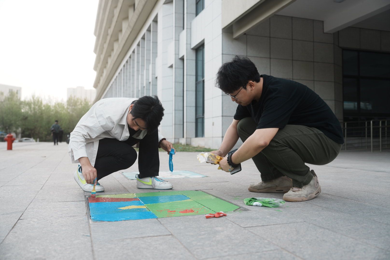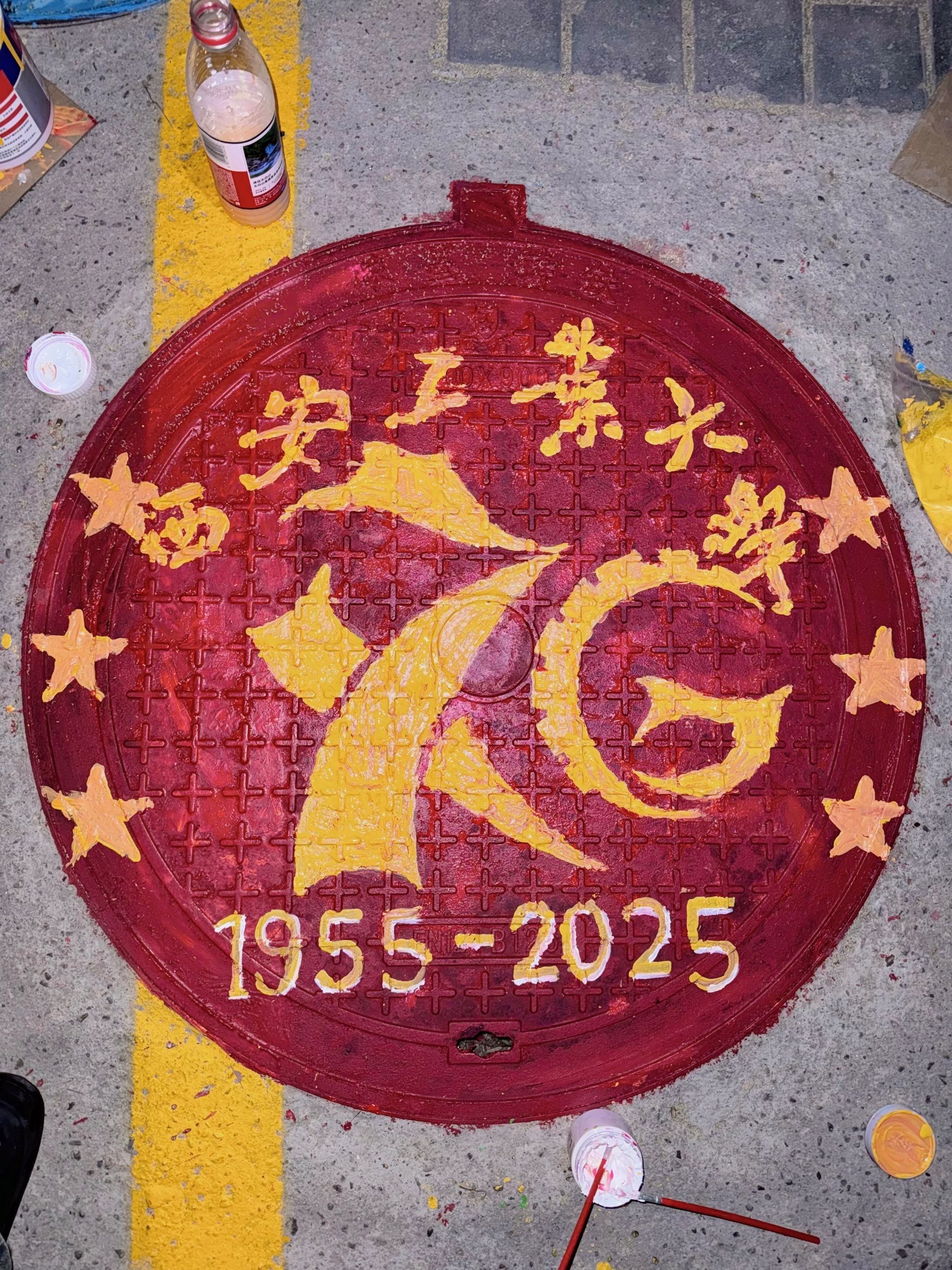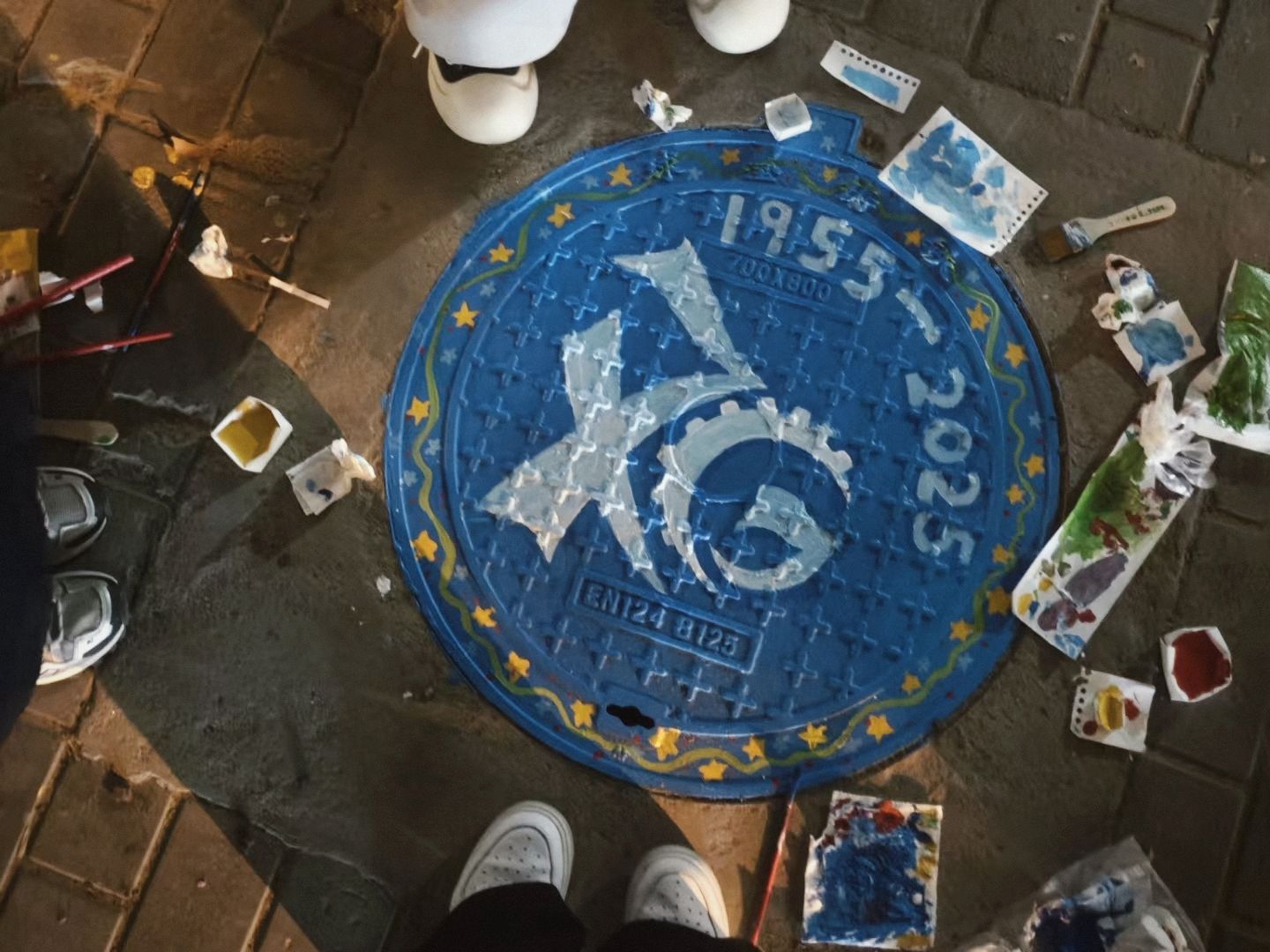 活动前期,学院团委面向学生征集设计方案,同学们结合70周年校庆、校园文化、自然生态、青春主题等元素,创作出一批优秀设计稿。经筛选,50余幅作品脱颖而出。活动当日,志愿者们早早来到指定区域,在简单的分工和准备后,便投入到井盖绘画的创作中,他们运用丙烯颜料和专业防水涂层,将专业课堂所学的色彩构成、空间透视、动漫形象、抽象艺术等知识转化为实践成果,将冰冷的铸铁设施转化为充满艺术气息的“校园画布”。22级视觉传达设计专业董璐媛说:“通过这次活动,我们真正体会到了艺术设计服务生活的意义,学以致用的同时还能为校园增添色彩,能为母校70周年献上青年学子的祝福,感觉特别有意义。”