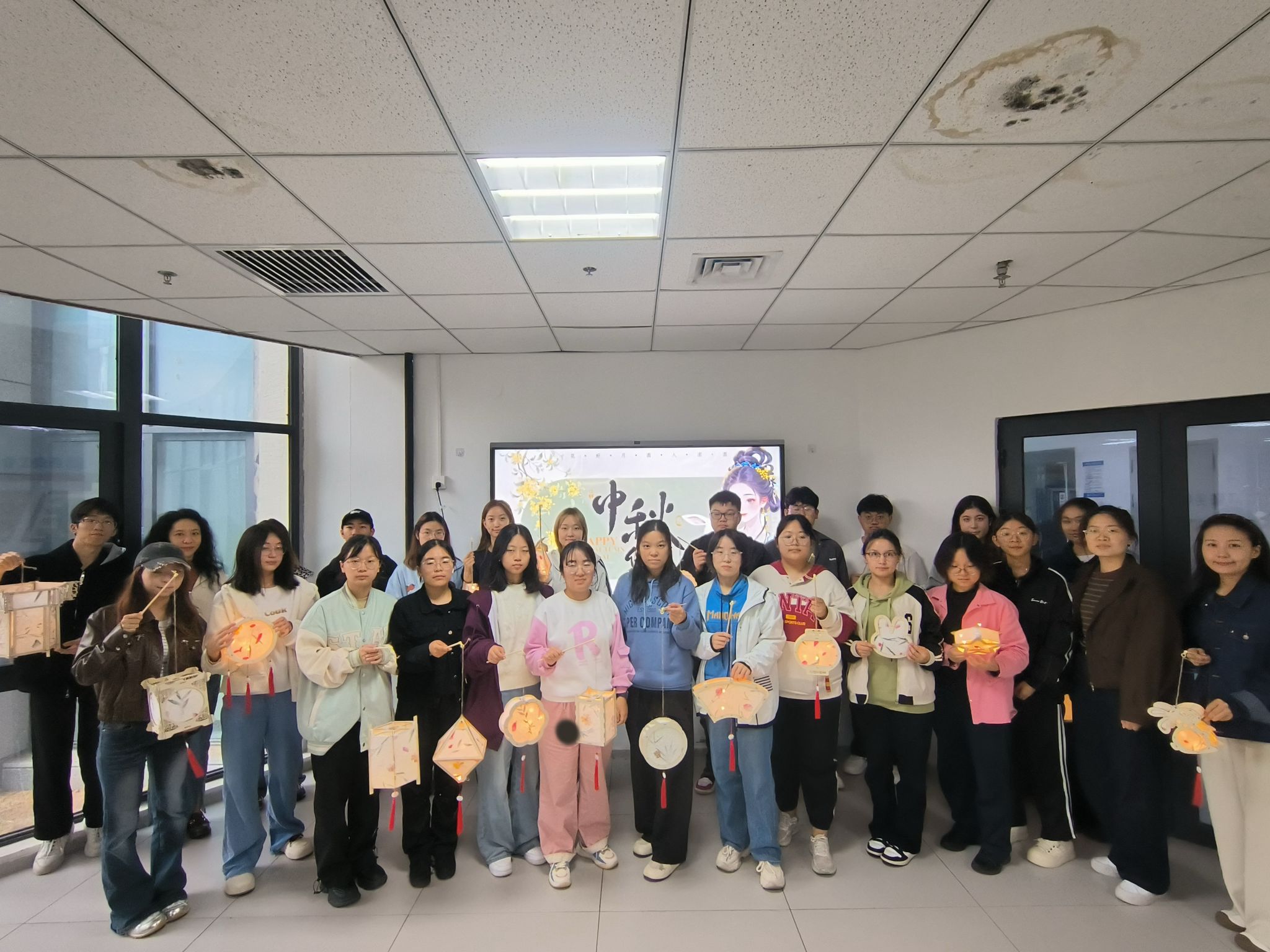在实践环节,工作人员为每位学生分发了花草纸、木制灯架、LED灯串、流苏等材料,通过分步演示与一对一指导,引导学生亲手制作灯笼。大家积极投入,充分发挥创意,将传统干花元素与现代审美意趣相融合,创作出各具特色的灯笼作品。制作完成后,一盏盏灯笼渐次点亮,柔和灯光透过花草纸映出自然灵动的纹理,现场仿佛重现“千灯映月”的诗意场景。活动尾声,工作人员为同学们送上月饼,表达节日祝福。