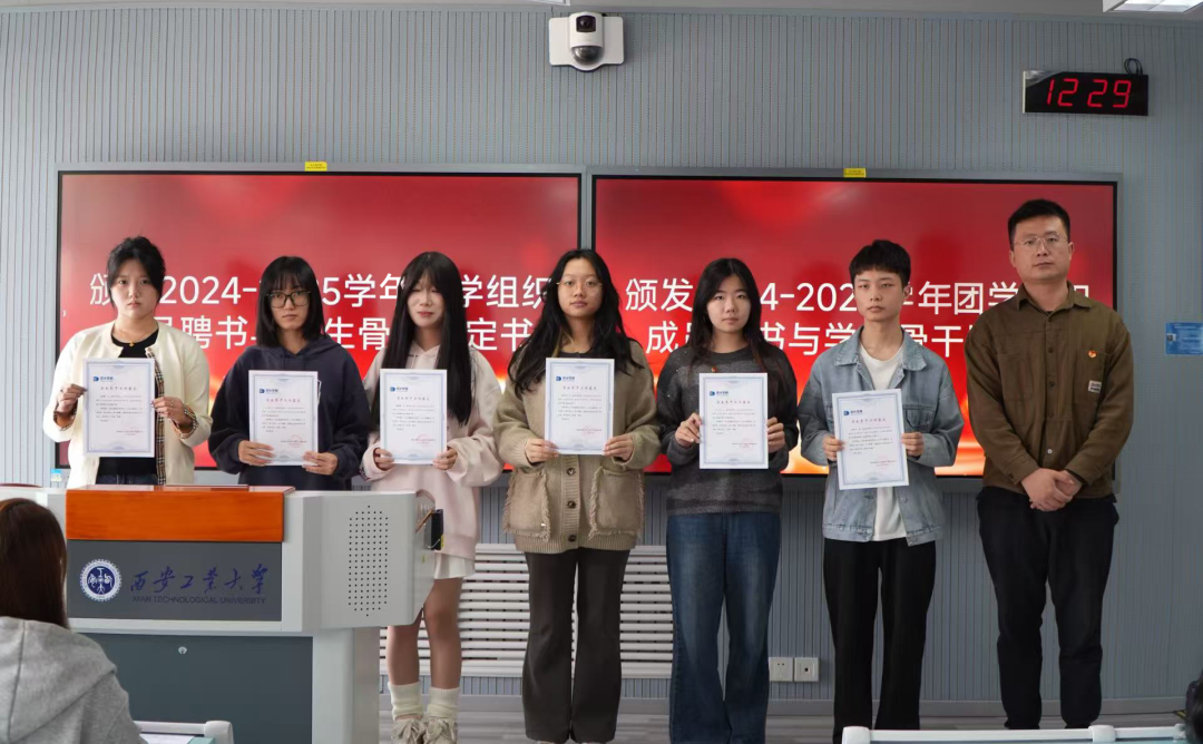 最后,许金鑫为上一届团学组织成员颁发聘书与学生骨干鉴定书,为新一届团学组织成员颁发聘书,并合影留念。