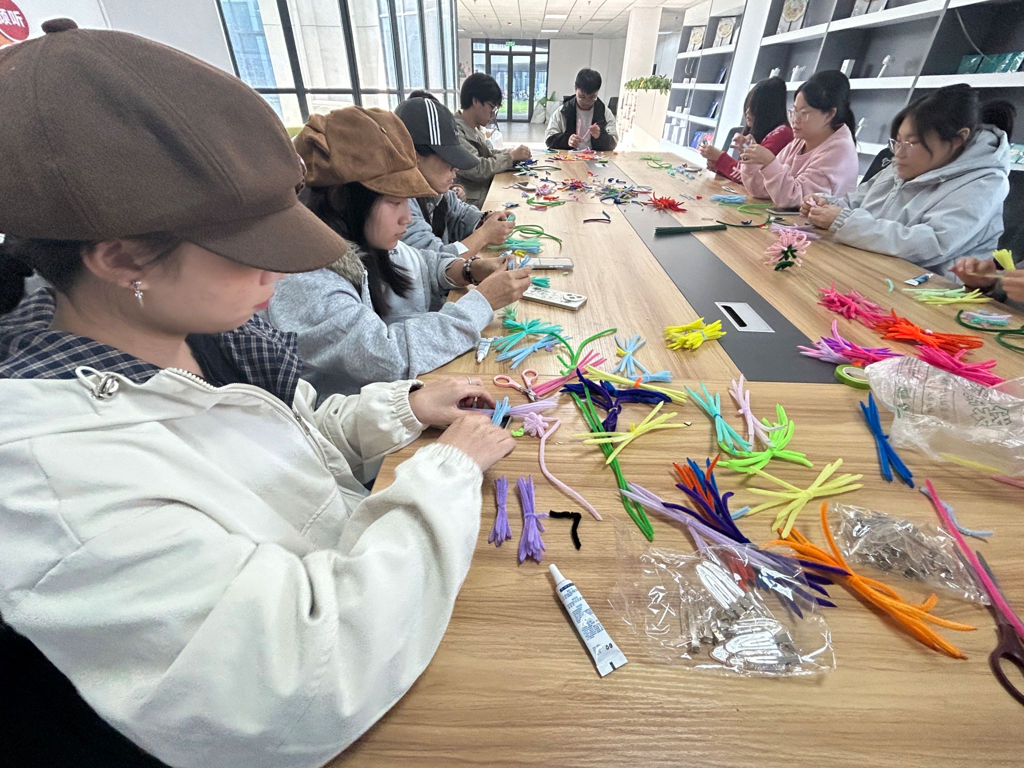 在动手环节中,学生们在“一对一”指导下创作出各具特色的扭扭棒菊花,并合影留念,现场洋溢着成就感和文化氛围。