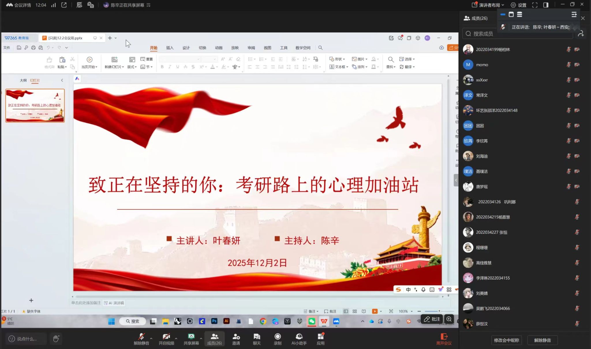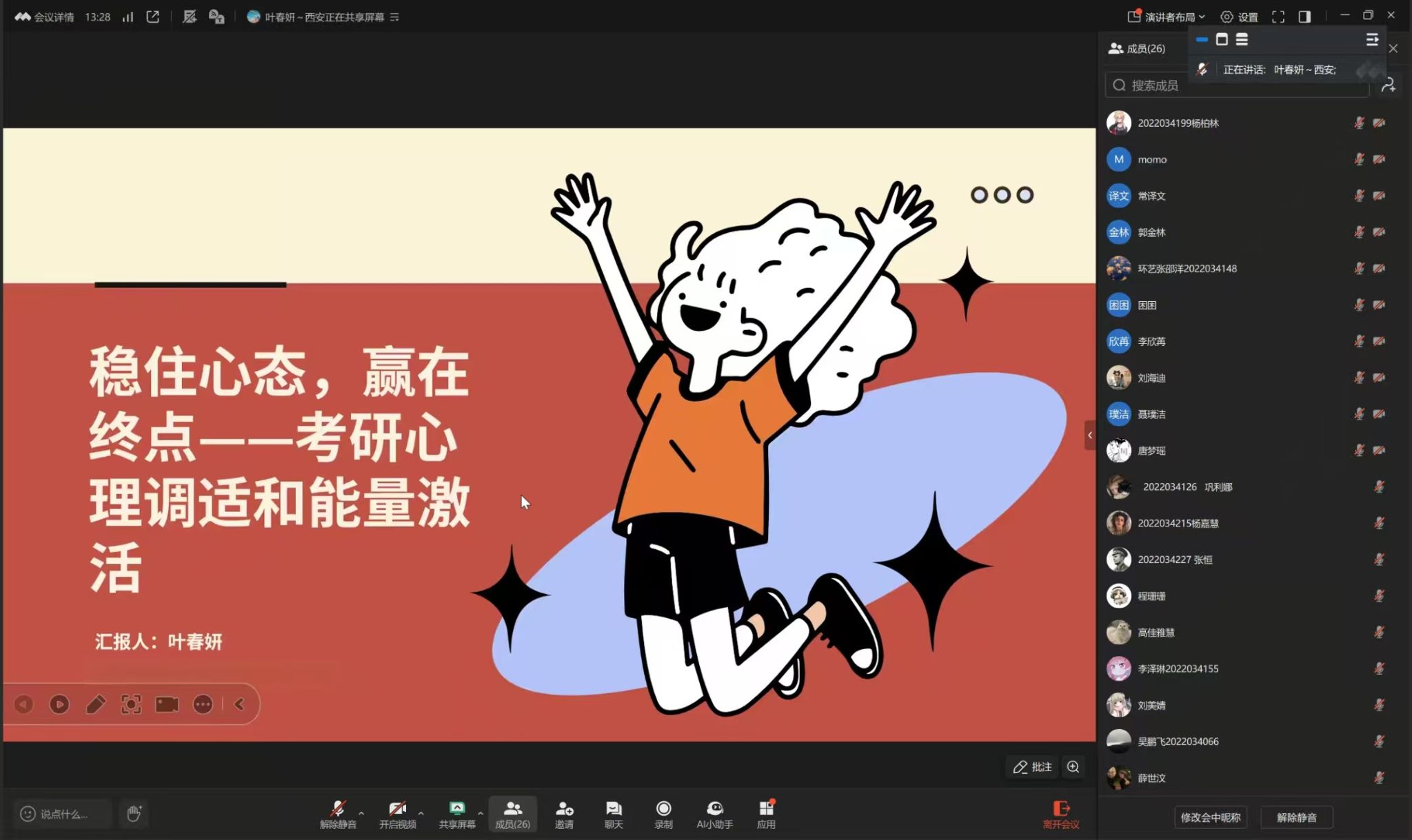 特别邀请国家二级心理咨询师叶春妍老师为2022级研究生考试备考学生召开“稳住心态,赢在终点——考研心理调适和能量激活”线上心理赋能讲座,2022级辅导员陈辛主持。