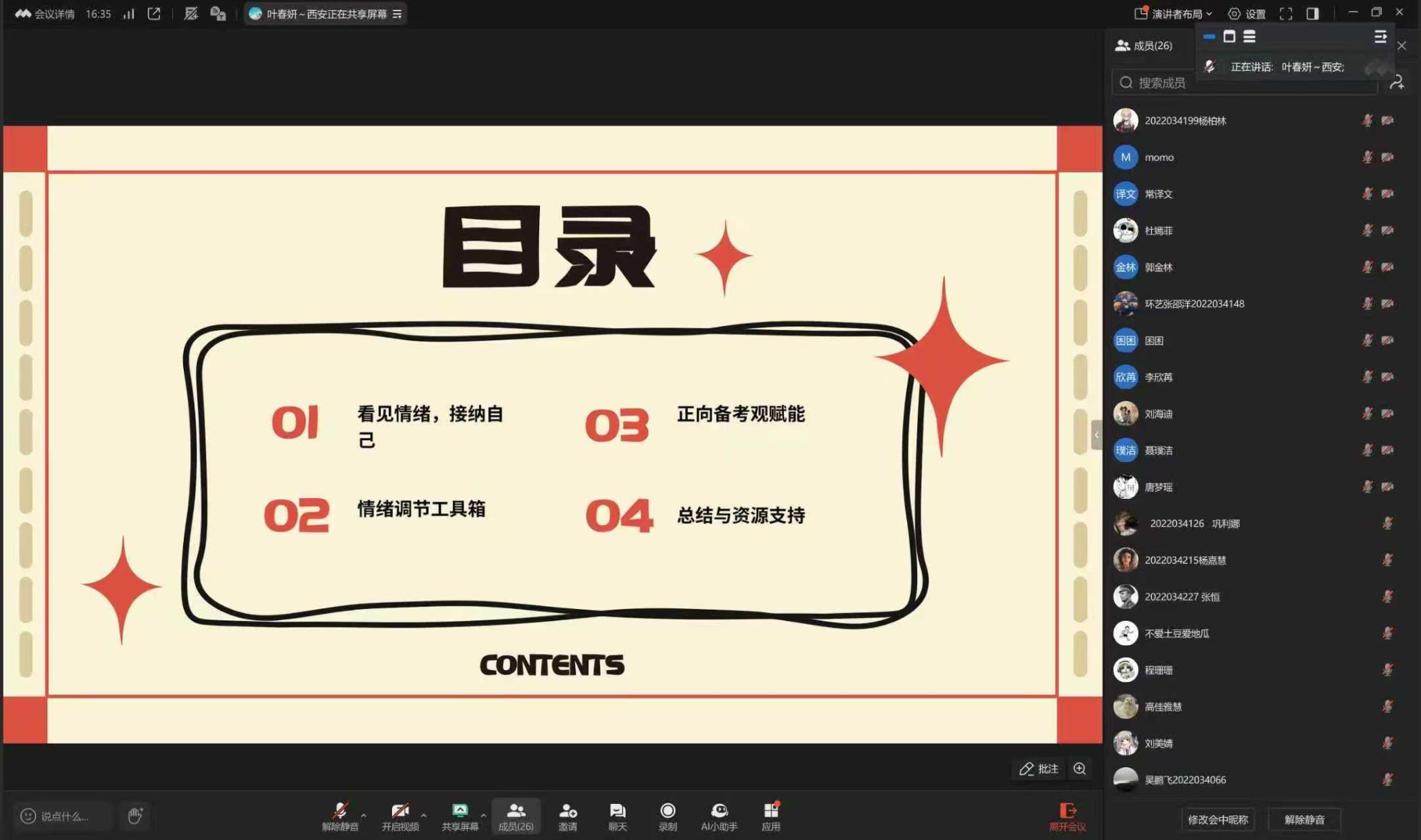 讲座上,叶春妍结合多年心理服务经验,从“看见情绪,接纳自己”“情绪调节工具箱”“正向备考观赋能”三方面展开。她通过“压力盲盒”互动让学生正视焦虑,用“倒U型曲线”解读焦虑的正向意义,并详细讲解4-7-8呼吸法、5-4-3-2-1感官着陆法等实用技巧,还引导学生通过成功可视化、优势清单梳理增强信心。此次讲座为考研最后阶段心理调适提供科学指导,助力学子以从容心态迎接考试。