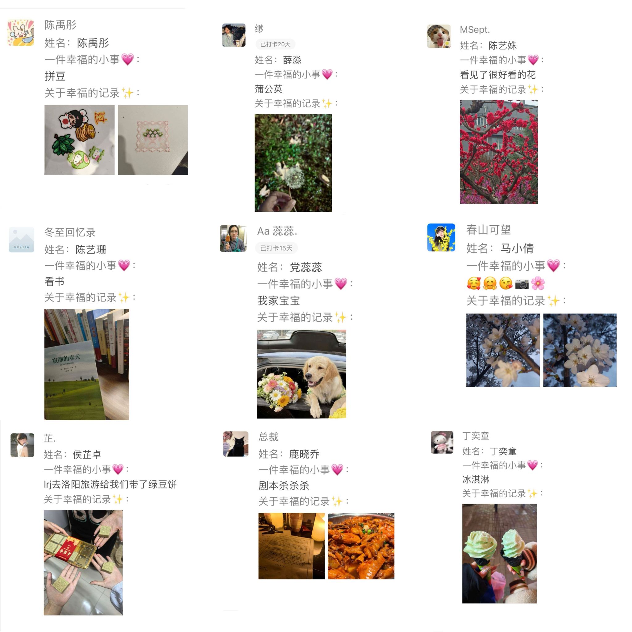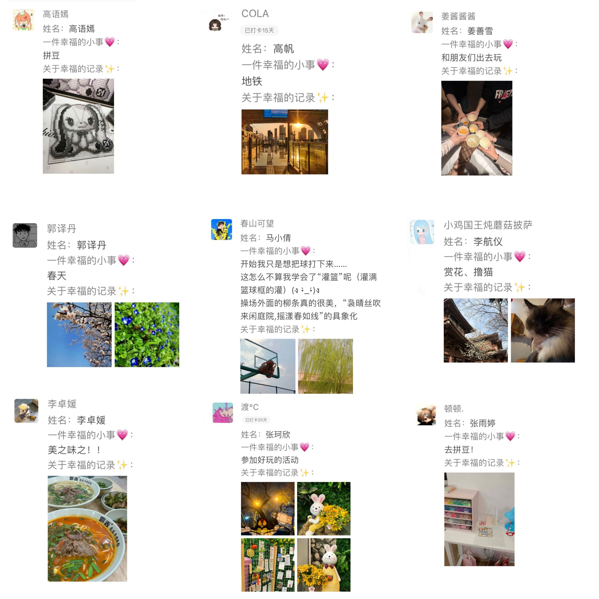 学院心育员刘文聪老师介绍,心理学认为21天可初步养成新习惯,活动旨在引导学生发现幸福、捕捉美好,先学会悦纳自己,再将温暖传递他人。活动期间,在心理委员组织下,同学们每日分享一件幸福小事,平凡日常化作珍贵回忆。打卡内容涵盖校园萌宠、烟火美食、自然景致、亲友陪伴与生活小趣。橘猫、白鹅、晚霞、玉兰、室友的牵挂、饭搭子的贴心、食堂阿姨的关怀、宠物的陪伴、观影赏花的惬意等,都成为治愈心灵的温暖片段。同学们用朴实文字抒发感动,在细微处感受生活善意。