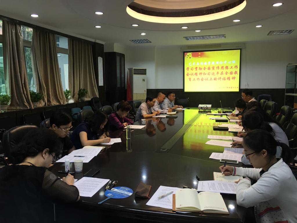 朱晋中首先带领大家一同学习了全国宣传思想工作会议精神和习近平总书记在全国教育工作会议上的讲话精神,并谈了自己的体会和思考,中心组成员王若鸿、金娜、周著、苏胜分别结合分管工作谈了自己对两个会议精神的认识,其他成员也踊跃发言。