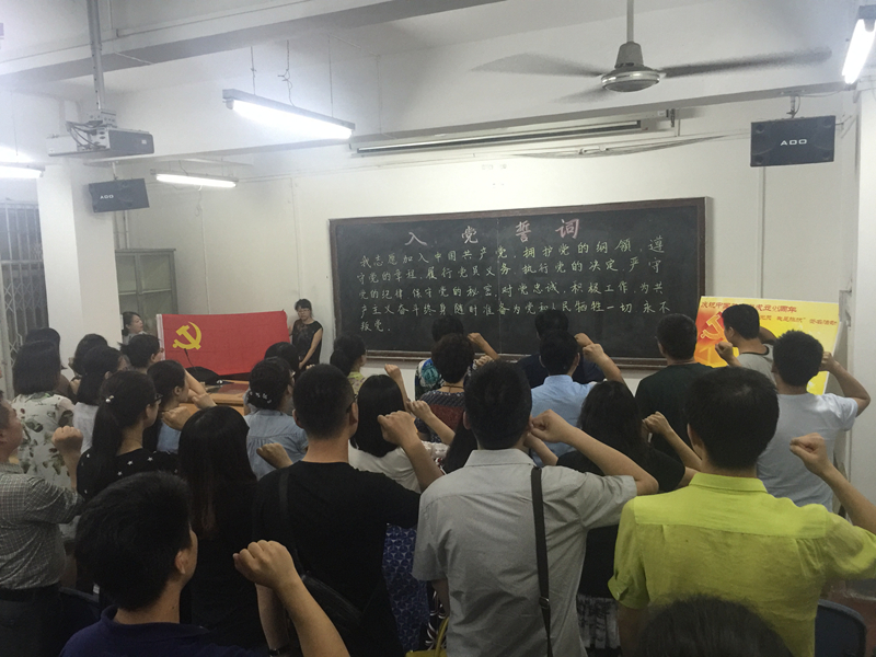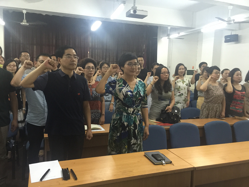 下午14时,学院党委组织全院党员以“重温铮铮誓词、不忘入党初心”为主题举行重温入党誓词活动和“我是党员、我是旗帜”主题党员承诺签名活动。在鲜红的党旗下,各位党员高举右手庄严宣誓,激昂的情绪和坚定的声音,使全体党员再次感受到肩上的责任、使命、荣耀;承诺签名活动中,各位党员依次在承诺牌上签署姓名,庄严的气氛鼓舞着全体党员积极投身“两学一做”学习教育,发挥党员示范作用,时刻以党员标准严格要求自己。