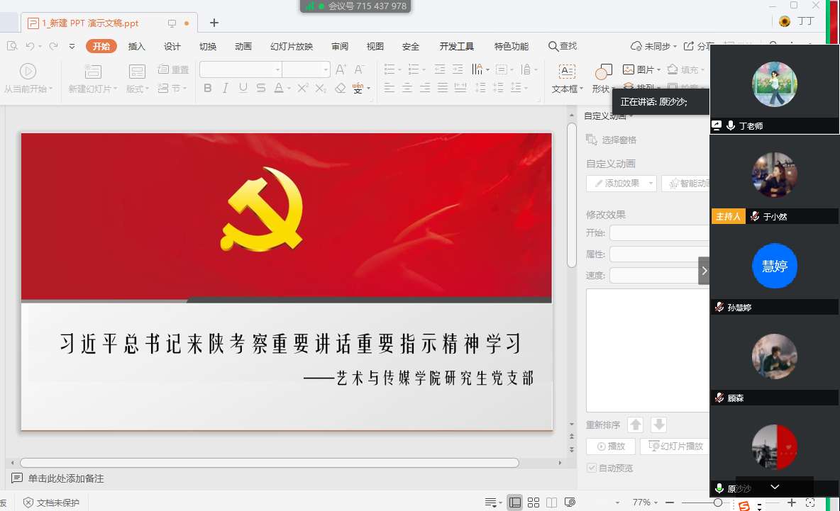 艺术与传媒学院研究生党支部在支部书记丁西蓓老师的带领下,通过视频会议的方式,学习“习近平总书记来陕考察重要讲话精神”和分享就业经验。