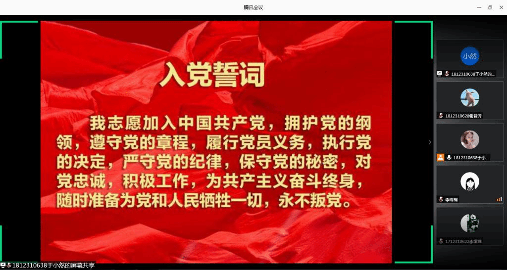 会议第二项议程,重温入党誓词。全体党员在丁西蓓书记的带领下重温入党誓词,同志们即使远隔千里也在同一时刻起立宣誓,表达对我党生日的忠心祝愿。