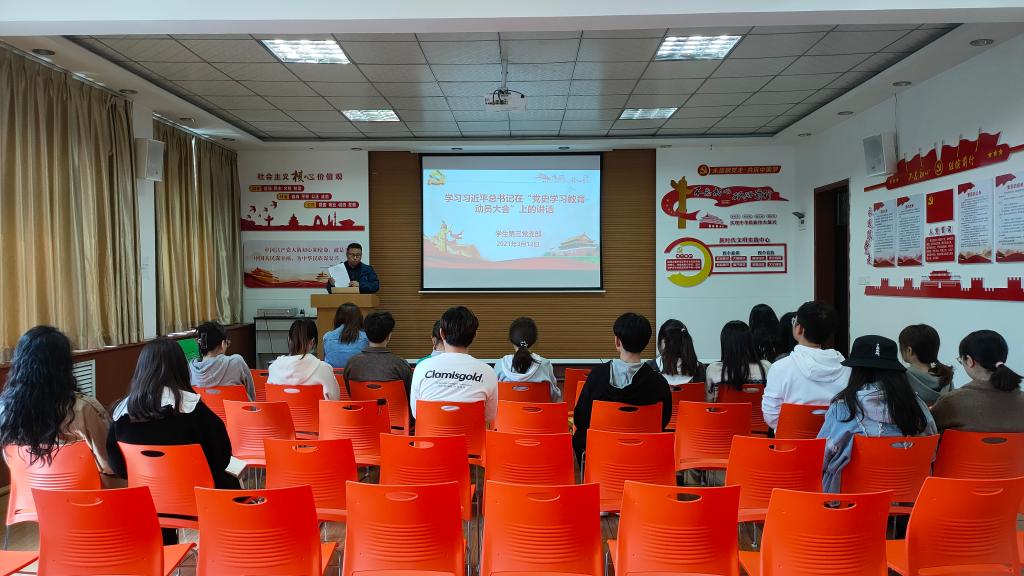 会上,张晓宾首先带领全体党员学习习近平总书记在“党史学习教育动员大会”讲话精神,要求全体党员在学思践悟的基础上严格落实习近平总书记讲话中提出的“全党同志要做到学史明理、学史增信、学史崇德、学史力行,学党史、悟思想、办实事、开新局,以昂扬姿态奋力开启全面建设社会主义现代化国家新征程,以优异成绩迎接建党一百周年。”;接着,大家共同观看了党史学习动员大会的新闻视频;最后,张晓宾就学生第三党支部学习贯彻习近平总书记讲话精神深入开展党史学习教育做了具体安排。