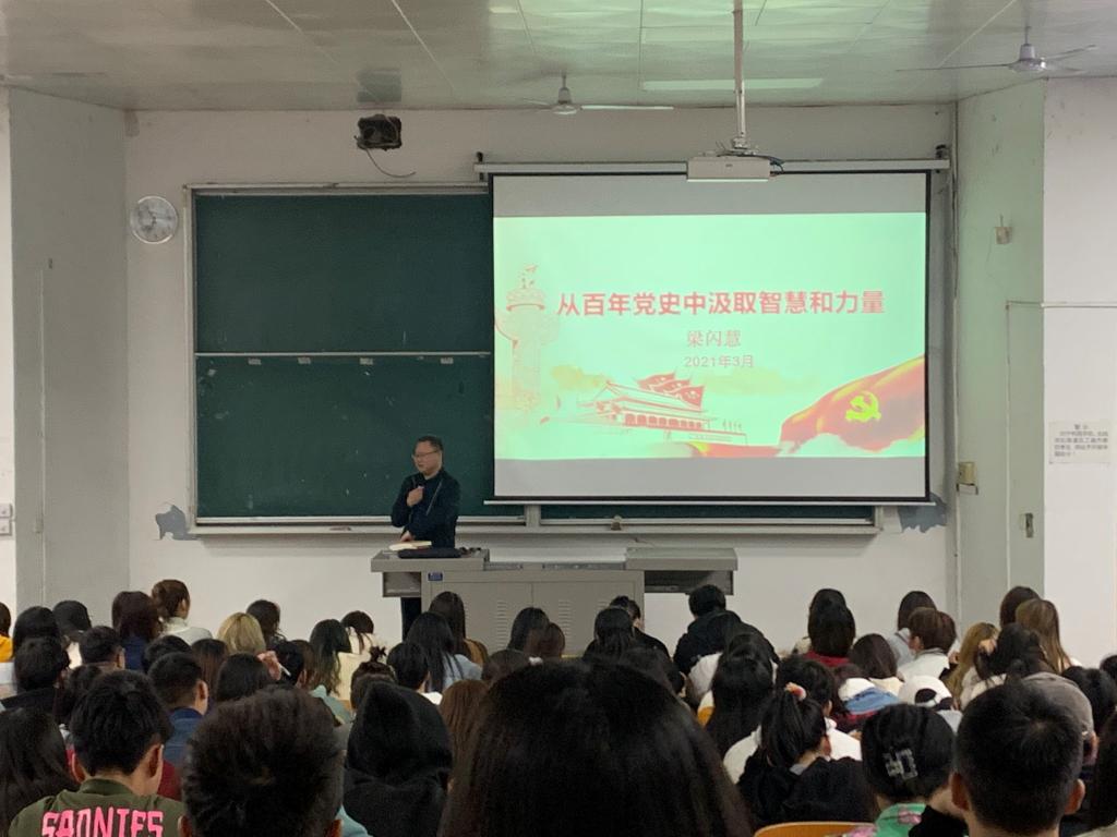 ,梁老师首先强调了为什么要开展党史学习教育,中国历来重视党史教育,注重用党的奋斗历程和伟大成就鼓舞斗志,明确方向。接着,梁老师向大家普及了从党史中可以汲取的知识,深刻感悟中国共产党始终不渝为人民的初心使命,进一步增强党的团结和集中统一。同时梁老师带领大家一起回顾了党的百年历程,并就必须坚持党的一切工作的领导,必须坚持马克思主义的指导地位,必须坚持从严治党等重要经验与启示为同学们强调。