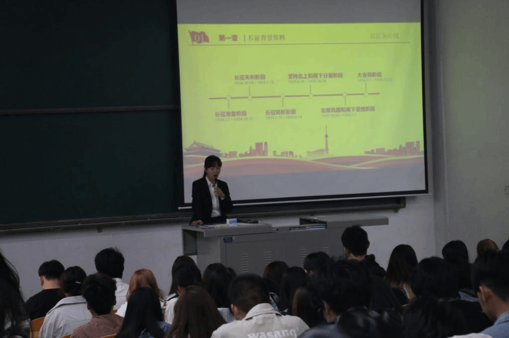 宣讲中,王老师围绕“长征的背景资料”、“习近平总书记的长征箴言”、“民族复兴需要圆梦精神和长征精神的融合升华”、“弘扬长征精神,走好新长征路”四个方面进行宣讲。首先,王老师以时间为顺序给大家讲解了长征路上中国工农红军所经历的重要战役,带领同学们回顾长征,缅怀先烈。随后,王老师围绕“习近平总书记的长征箴言”以及“民族复兴需要圆梦精神和长征精神的融合升华”两个主题思想向大家做了介绍。王老师引用习近平总书记的重要讲话精神指出:长征永远在路上,每一代人有每一代人的长征路,每一代人都要走好自己的长征路。最后,王老师带领我们展望未来,去感受中国未来建设发展的宏伟蓝图。弘扬长征精神,走好新长征路,王老师希望同学们能够不忘初心,传承好、弘扬好伟大的长征精神,为实现“两个一百年”奋斗目标的新长征,继续提供强大的精神力量。