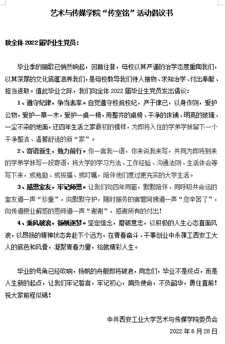 为持续加强学生党员教育,充分发挥学生党员先锋模范作用,7月初,艺术与传媒学院向2022届全体毕业生党员发出“传室铭”活动倡议,得到了全体毕业生党员的积极响应。