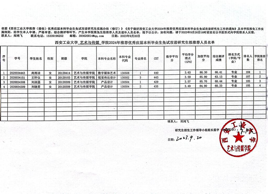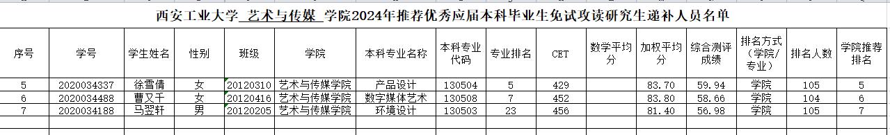 艺术与传媒学院2024年推荐优秀应届本科毕业生免试攻读研究生递补人员名单