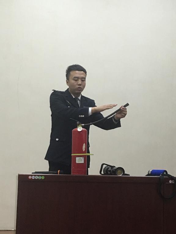 通过学校保卫处请来了西安市消防大队消防警察董教官向参加演习的同学和教职员工讲解消防安全知识,火灾现场注意事项等,保卫处的项老师现场对演练中各类消防器材的性能、操作方法进行了演示。
