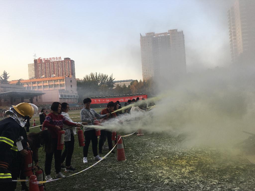 随后在辅导员与保卫处兼职消防员的组织下,进行了消防演练。演练过程中消防人员手把手向学生及教职员工传授灭火器使用方法以及注意事项,并让学生亲自实际操作,体会使用灭火器灭火的方法。