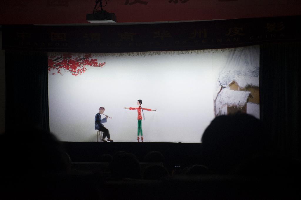 此次皮影演出共分为两个环节,首先是各类皮影创新节目展演,中间是现场活动环节。薛老师团队先后表演了《芭蕾舞白毛女》《丝路风》 《聪明的猴子》 《闹社火》 《鹤与龟》 《迈克尔.杰克逊》 《猪八戒背媳妇》等剧目。其中经过创新的节目《迈克尔.杰克逊》,给大学生们留下深刻印象,迈克尔.杰克逊的经典舞步模仿的惟妙惟肖,得到广大观众的热烈掌声;《猪八戒背媳妇》的表演诙谐幽默,是陕西方言与华州皮影完美的结合。演出现场大学生们还与皮影表演进行了近距离的接触,同学们纷纷上台参与到皮影的表演中,同学们的即兴表演使活动现场异常热烈。