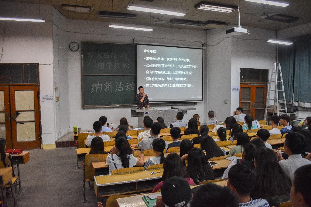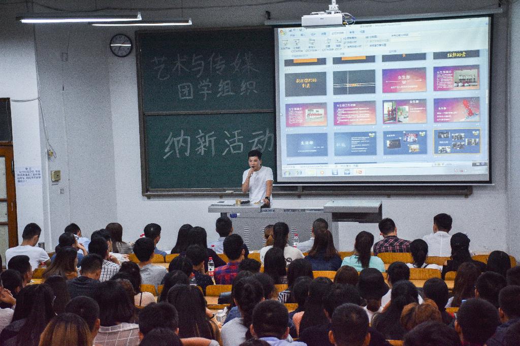新生的大学课余文化生活,给新生们提供一个自我展示、相互交流的平台,为学生会及各个社团注入新活力。2016年9月21日,艺术与传媒学院在4F-J1举行了学生会、艺术团的纳新大会。参加大会的有新生辅导员赵晋锐、团委副书记王嘉琪,团委各部门部长,学生会主席邹中林、副主席杨金瑶、杨金珂,学生会各部部长、副部长,大艺团团长、各部门部长及2016级新生。