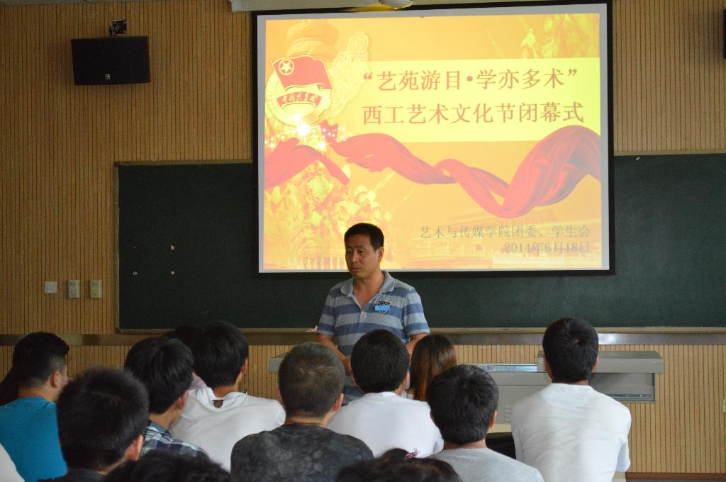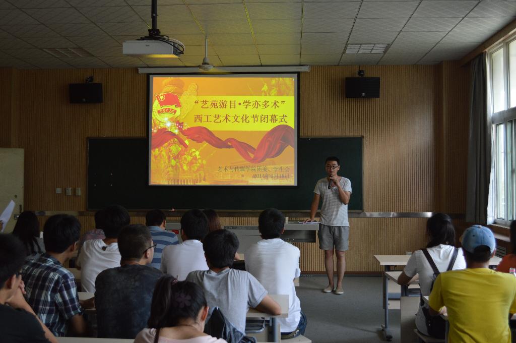 历时两个月的“艺苑游目·学亦多术——西工艺术文化节”于2014年6月18日下午17:30在我校未央校区教4—201举行闭幕式,艺术学院学生会副主席文睿主持闭幕式,学院团委书记张晓宾老师,辅导员杨海斌老师,院团委、学生会全体成员参加了闭幕式。
