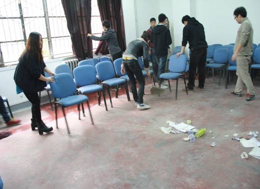 受助学生的感恩诚信教育,给同学们营造良好的学习环境,艺术与传媒学院于2013年10月29日下午15点在金花校区开展了清扫桌面污垢和教室卫生的义务劳动活动。
