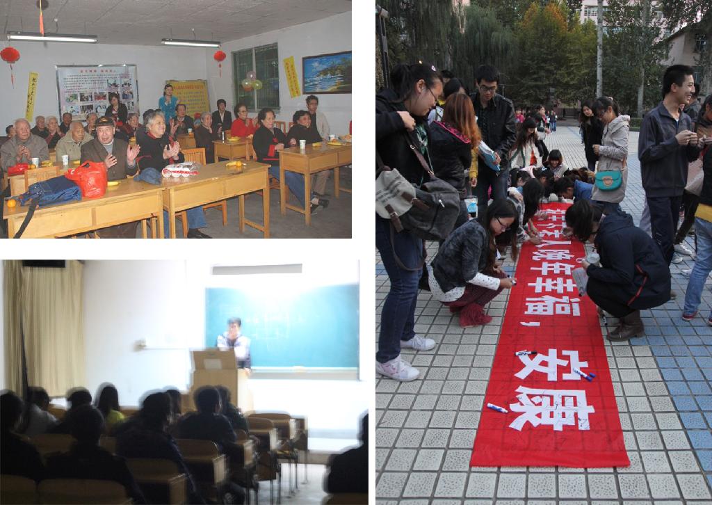 组织了一支20人的爱心志愿者小队来到星光老人院。福利院的工作人员和老人们对我们的到来表示热烈的欢迎和感谢,同学们和老人曲膝交心。有的同学积极的为老人们整理生活环境;有的和老人们聊天。最后,同学们拿出了自己的礼物送给老人们,学生代表也将签名祝福及书画送给了老人们; 23日晚上,在教6楼501教室学生会组织开展了“重阳节习俗”讲座及观影活动,通过真实事例告诉大家尊老爱老的传统,告诉大家“老人的今天,就是我们的明天”。一部《桃姐》的影片,深深的感染了每一位同学,会后同学们感触颇多,纷纷表示要多关心长辈,让爱心不断传递。