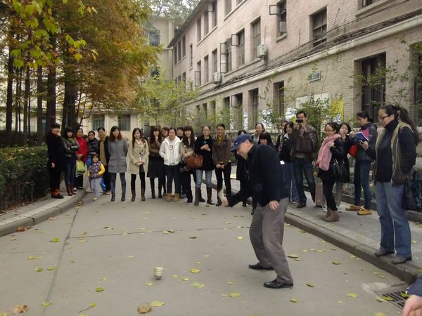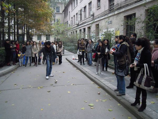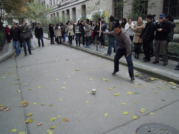 院工会自制了活动工具—陀螺,采取以系为单位的分组对抗形式,由每系选派三名教师代表,每队每人在场地内依序掷抽,取陀螺转动时间最长者为获胜单位,依次选取第二、三名次,并发放活动纪念品。