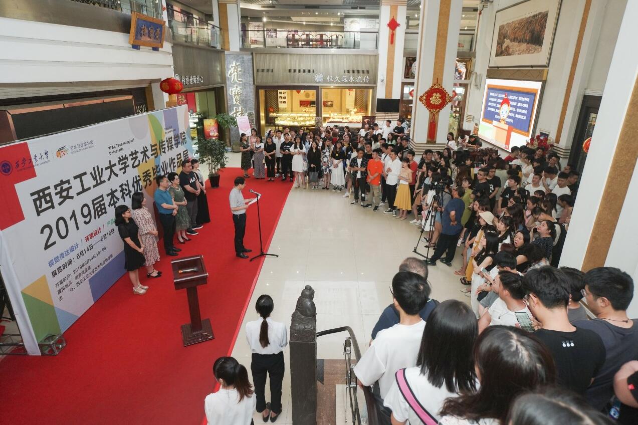 艺术与传媒学院2019届本科优秀毕业作品展在西安亮宝楼举行。艺术与传媒学院党委书记周著、院长王若鸿、副书记金娜、全院教师、2019届全体本科毕业生及社会各界人士参加了开幕式,开幕式由副院长刘萍主持。