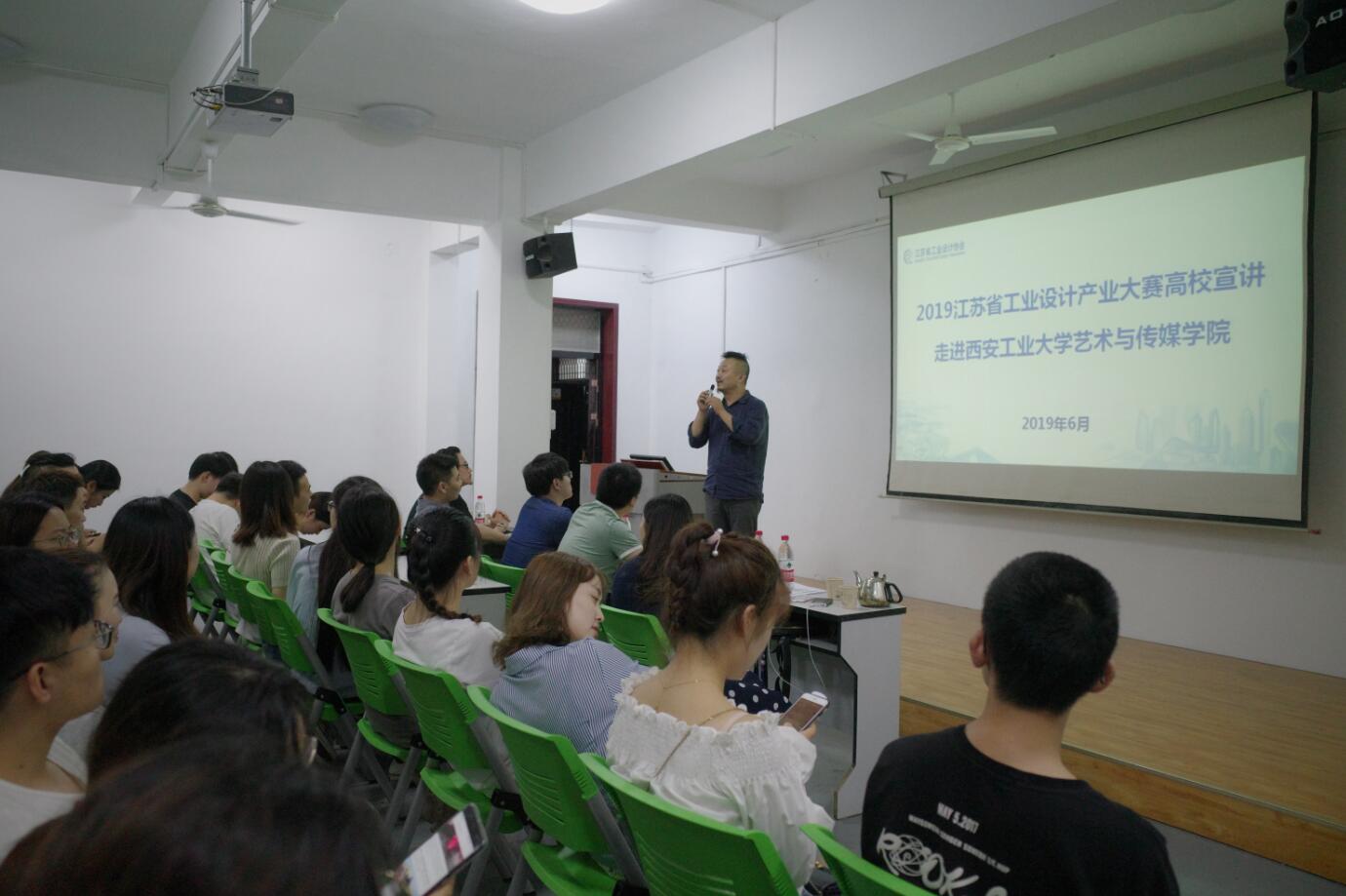 艺术与传媒学院行政楼3F多媒体教室内,由艺术与传媒学院主办、江苏省工业设计协会协办的“2019江苏省工业设计大赛高校宣讲大会”在金花校区多媒体教室举行。江苏省工业设计协会秘书长江莉、江苏东方创意文化产业有限公司总经理李建全及江苏四家企业负责人等一行6人共同出席本次产业大赛宣讲。宣讲会由艺术与传媒学院副院长苏胜主持。