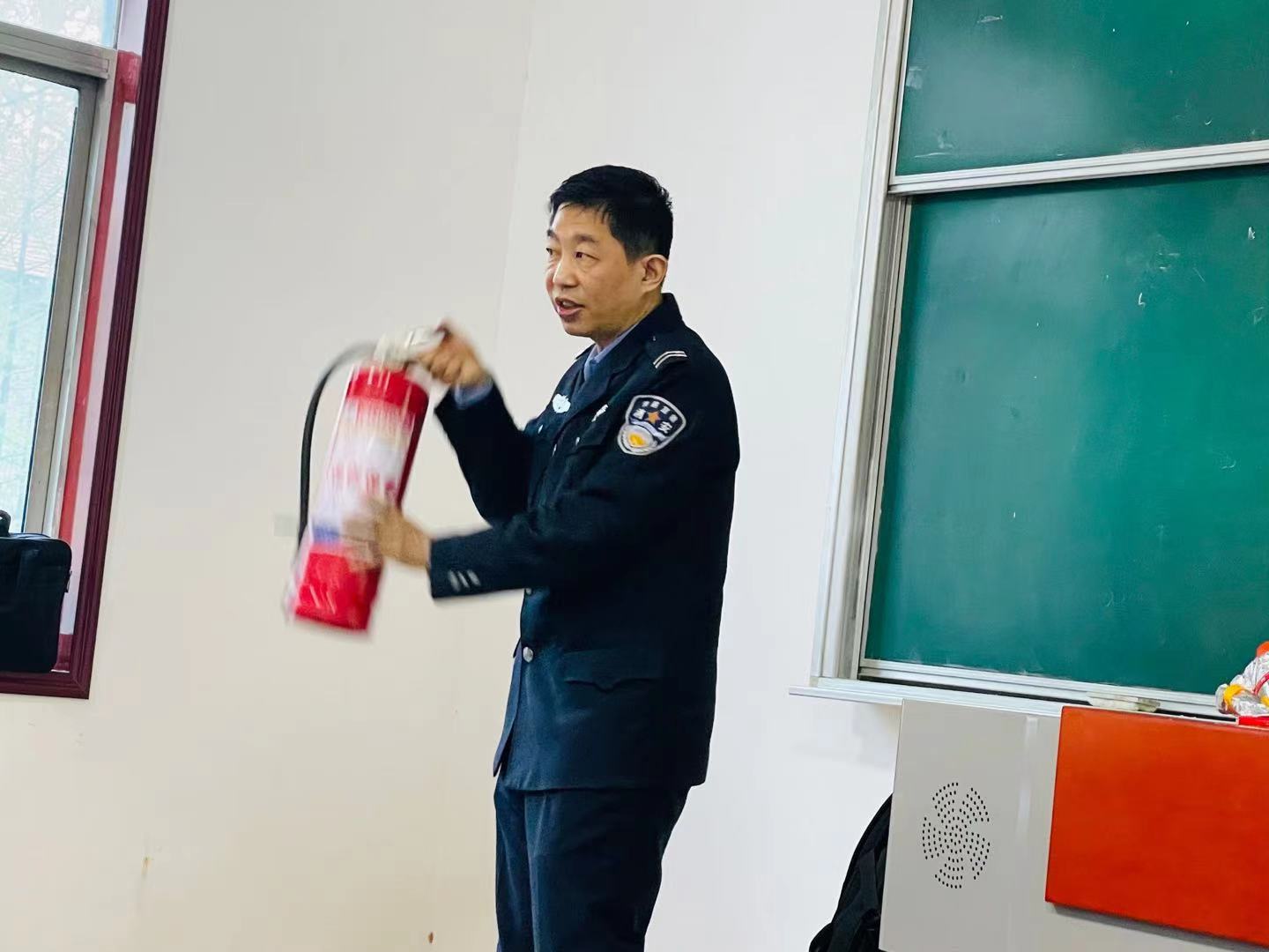 谢教官强调 “隐患险于明火,防范胜于救灾,责任重于泰山”。 谢教官现场展示消防器材及介绍使用方法和灭火器的使用方法。全体教师认真倾听并积极参与实践模拟灭火