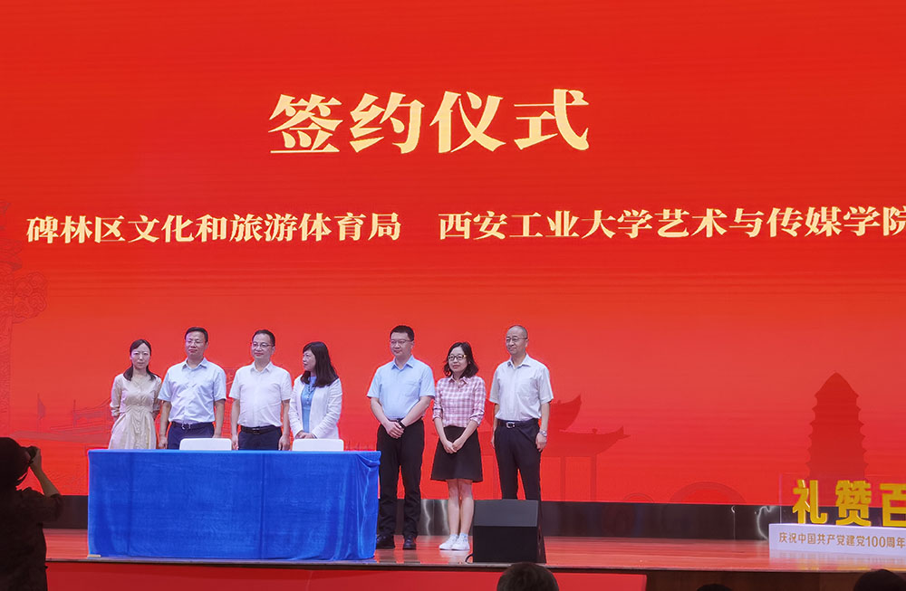 刘萍副院长共同签署了“非遗创新人才联合培养基地”的协议,碑林区委组织部部长周振强、学院党委书记周著等上台见证了签约过程。