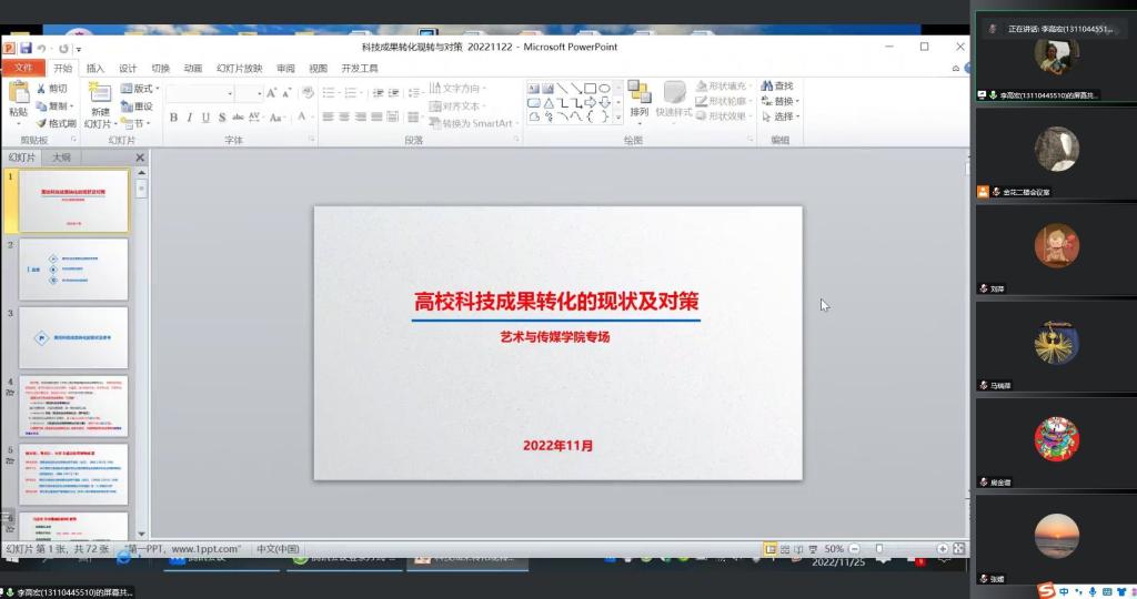 邀请到校科学技术研究院李高宏主任在腾讯会议线上做题为“高校成果转化之现状及对策”的学术讲座,讲座由副院长刘萍主持,学院教师及研究生70余人参加了本次讲座。