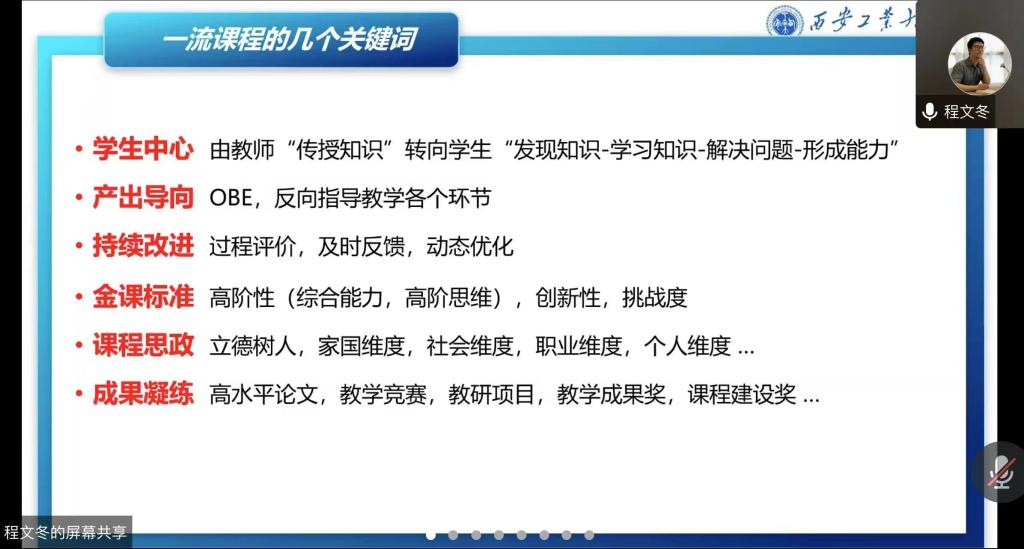 教师发展中心特聘专家、国家级一流本科课程负责人程文冬在腾讯会议线上带来《一流课程建设与申报》主题学术报告。会议由副院长姚文婷主持,院长苏胜、副院长刘萍以及学院教师60余人聆听了本次讲座。