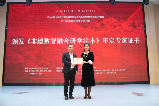 陕西非物质文化遗产研究基地负责人、学院党委书记周著为灞桥区政协委员成雯颁发《非遗数智融合研学绘本》审订专家证书。