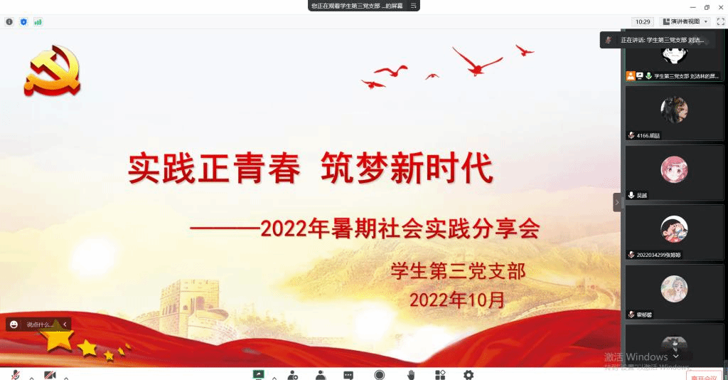 10月18日,学生第三党支部以“实践正青春 筑梦新时代”为主题开展暑期社会实践线上分享会。活动由党支部书记杨娜娜主持,支部全体党员参加。