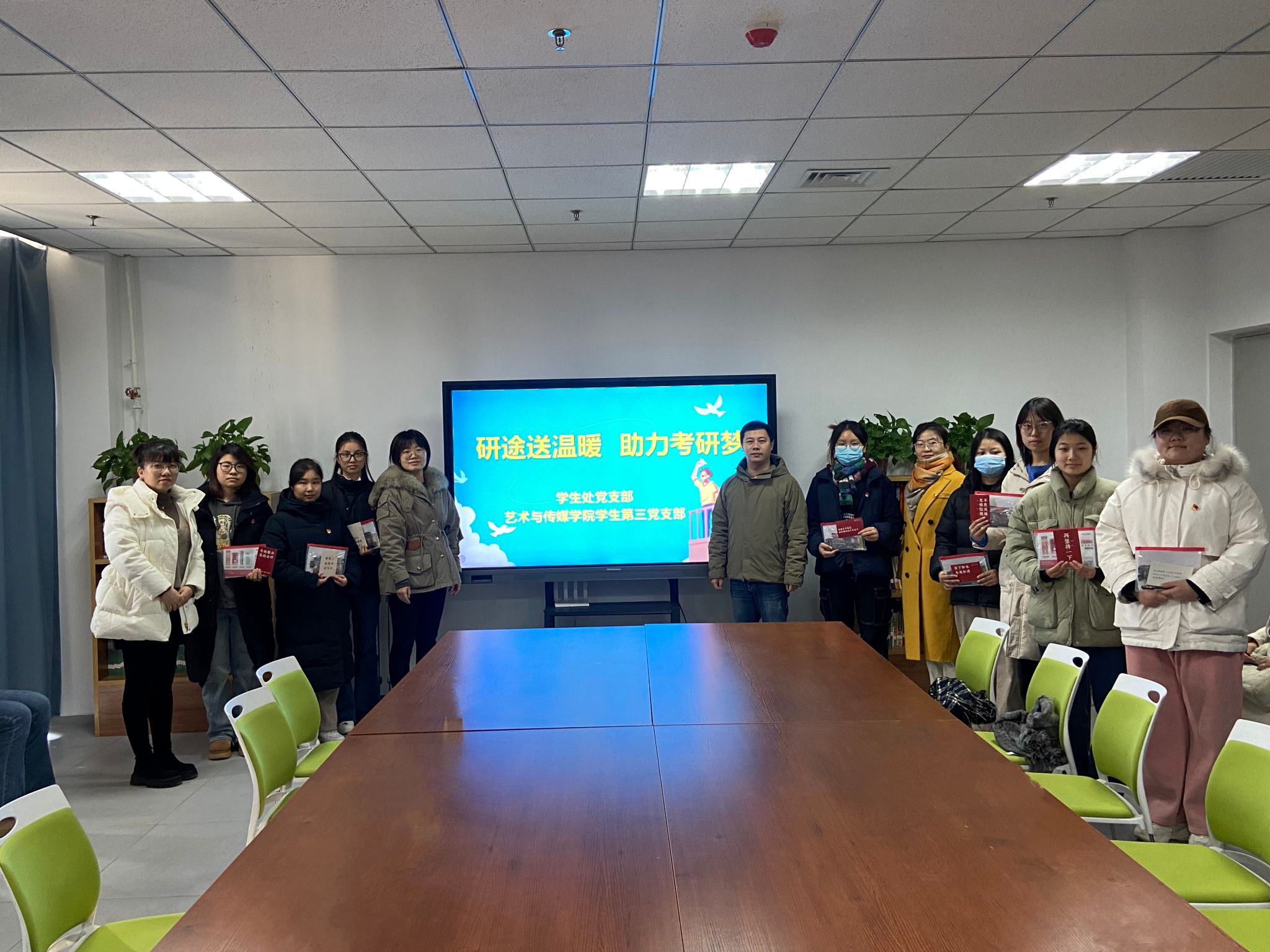 2024年全国硕士研究生招生考试将至,为缓解考研学子考前压力,增强迎考信心,12月20日,艺术与传媒学院学生第三党支部与学生处党支部在教7-617联合举办“研途送温暖 助力考研梦”考研党员考前送温暖活动。