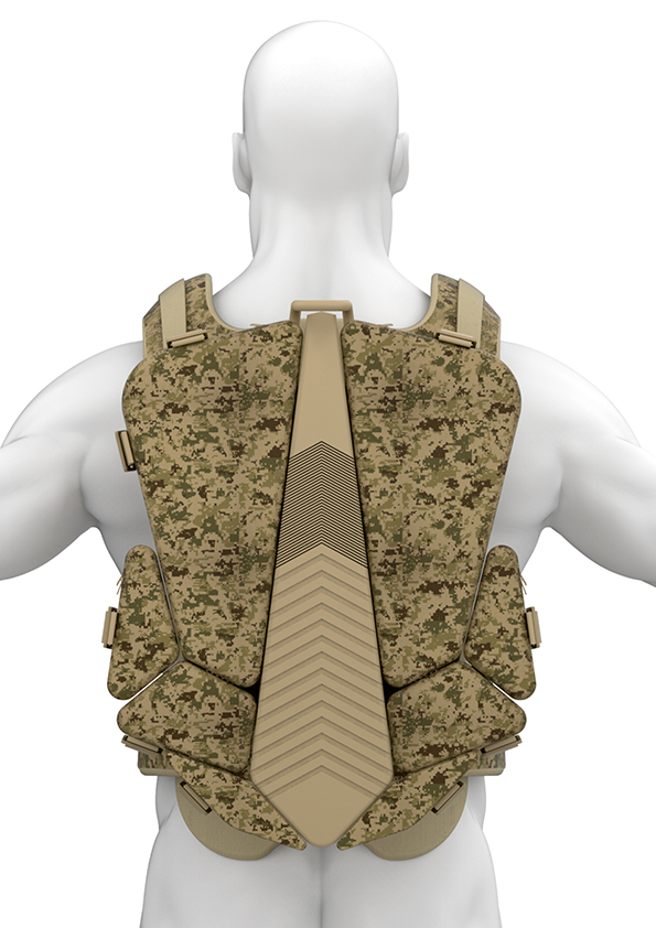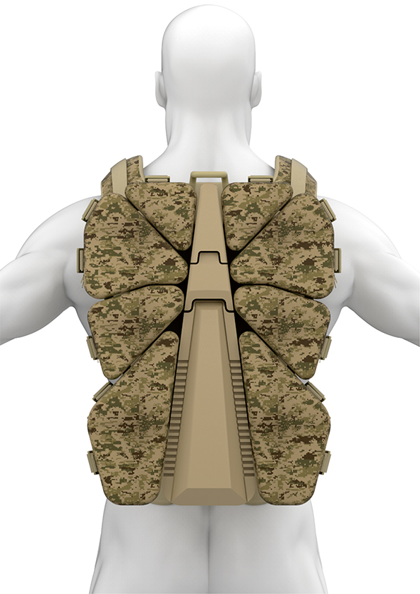 本文分别从军用背包背负和存储两个系统提炼主要的需求目标,并寻找能够与之形成相似性的生物特性。背负系统:主支撑骨架和部分辅助支撑的结合将参照蛇亚目的脊柱与肋骨,以及肌肉之间的结构体系来进行完善;存储系统:主要借鉴蛇头部和腹部鳞片分布进行功能的分配和造型提取,实践中背负系统将外架包与内架包的特点相融合,采用框架形式结合,外架框避免了背部与背包的直接接触,通风性和稳定性更佳;在贴近人体背部的部位,背负与腰带、肩带采用“S”形的设计,既可调整重心也可合理分负重力;这种外挂式的背负系统可以实现一种背负系统搭配不同的作战模块,满足不同的作战单元和需求,这种设计理念更符合课题提出的模块化存储的需求。